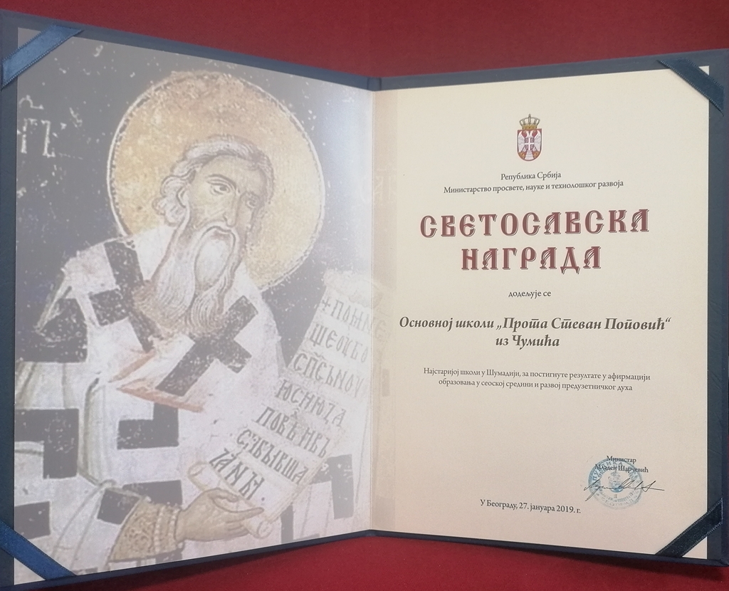 Министарство просвете, науке и технолошког развоја доделило је Светосавску награду, нашој школи, за постигнуте резултате у афирмацији образовања у сеоској средини и развој предузетничког духа.