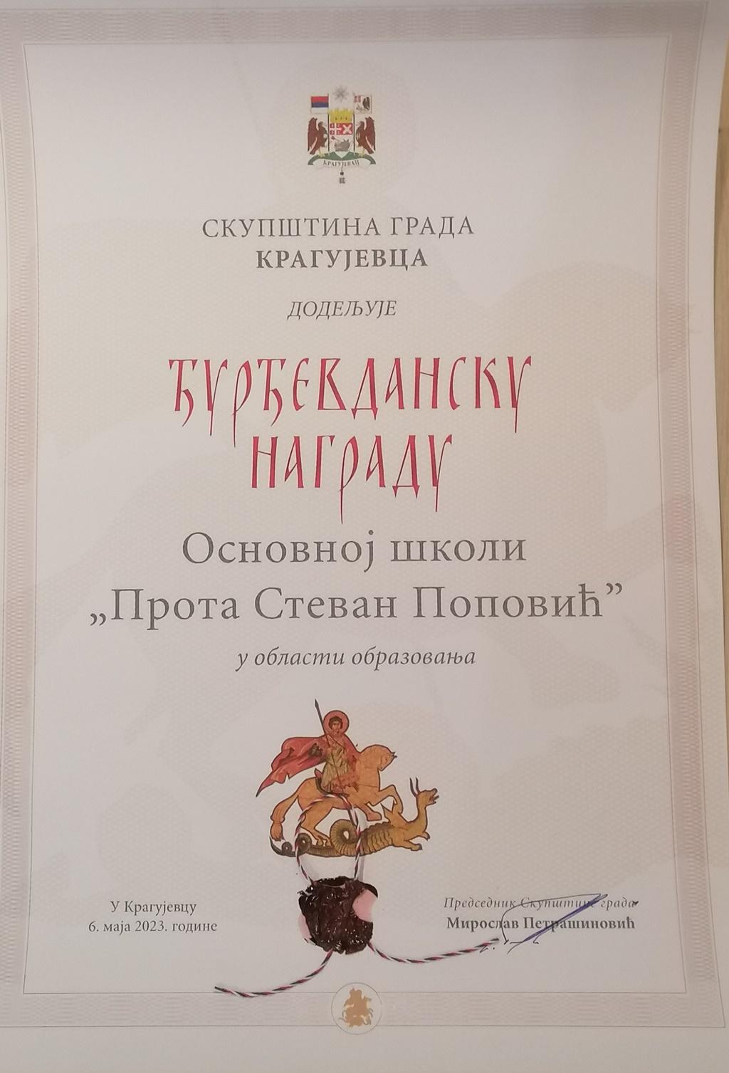 На основу одлуке Скупштине града Крагујевца, а на предлог Градског већа, нашој школи је додељено највеће признање у области образовања града Крагујевца „Ђурђевданска награда“. Награда је додељена у области образовања, а за нову наставну активност „Наслеђе мог краја“ коју је наша школа осмислила.